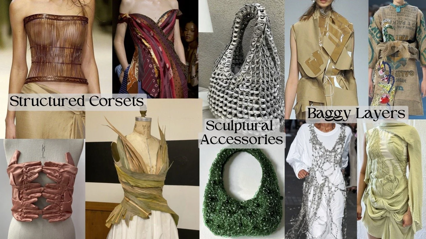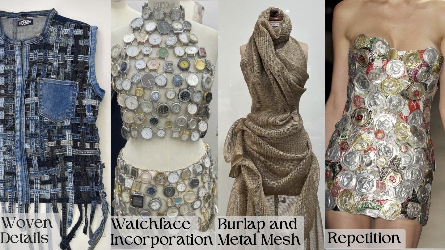 The details of this trend are defined by intricate, resourceful embellishments that combine craftsmanship with concept. Woven details highlight the artisanal quality of the trend, while repurposed watch faces and industrial metals become accessories and structural elements. Repetition and circular motifs created from soda tabs, cans, watch faces, and connected hardware reference the cyclical nature of sustainability. By layering raw textiles with industrial materials, the trend visually expresses harmony between opposites and the reinvention of the old into the new.