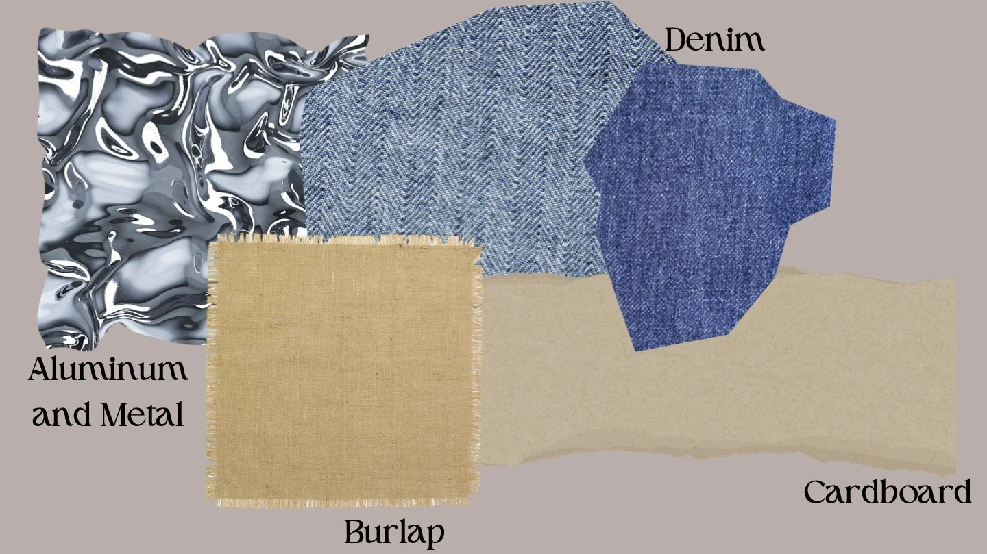 Scrap Chic materials focus on sustainability and reinvention. Raw burlap and recycled fabrics bring organic texture, while upcycled denim is a consistent and staple material used throughout the trend. Industrial elements like aluminum, bottle caps, watch faces, and other reclaimed metals add reflective moments that contrast beautifully with softer, organic materials. Even unexpected materials like cardboard are transformed into couture forms.